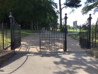 Two sets of late 19th/early 20th Century iron gates and gate posts located at the North West and North East corners of the Recreation Ground. Each set of gates consists of 3 square, cast iron posts, together with a single-leaf, wrought iron pedestrian gate leaf and a similar pair of wrought iron double gate leafs. The posts, from the Baylis foundry in London, are of a light 1890’s character. The gate leafs consist of sets of ‘wriggling’ full height and half-height standards supported by bottom, middle and top rails and with curved & curled finials of an archetypal 1920’s feel. Unlike the railings that enclosed the Recreation Ground, these gates luckily survived the 1940 salvage campaign and as a reminder of what was lost, are of much local historic importance. They are also of considerable townscape value.