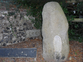 Mentioned in local stories for over 150 years there are many versions of the Devil's Stone legend, but all tell the same basic story. Tradition says the devil was fed up being woken up every Sunday morning by the bells ringing so he took the bells but fell coming down the tower and left his footprint in the stone. As he fell the bells rolled into the Libbet Stream. The stone stood for several hundreds of years on the eastern bend of Church Lane/Iwade Road before being moved across the lane to the corner of Church Lane/School Lane in 1931. It was moved to the entrance of the churchyard in 1935 and, more recently, to a corner of the church car park. A plaque marks the 1936 move.